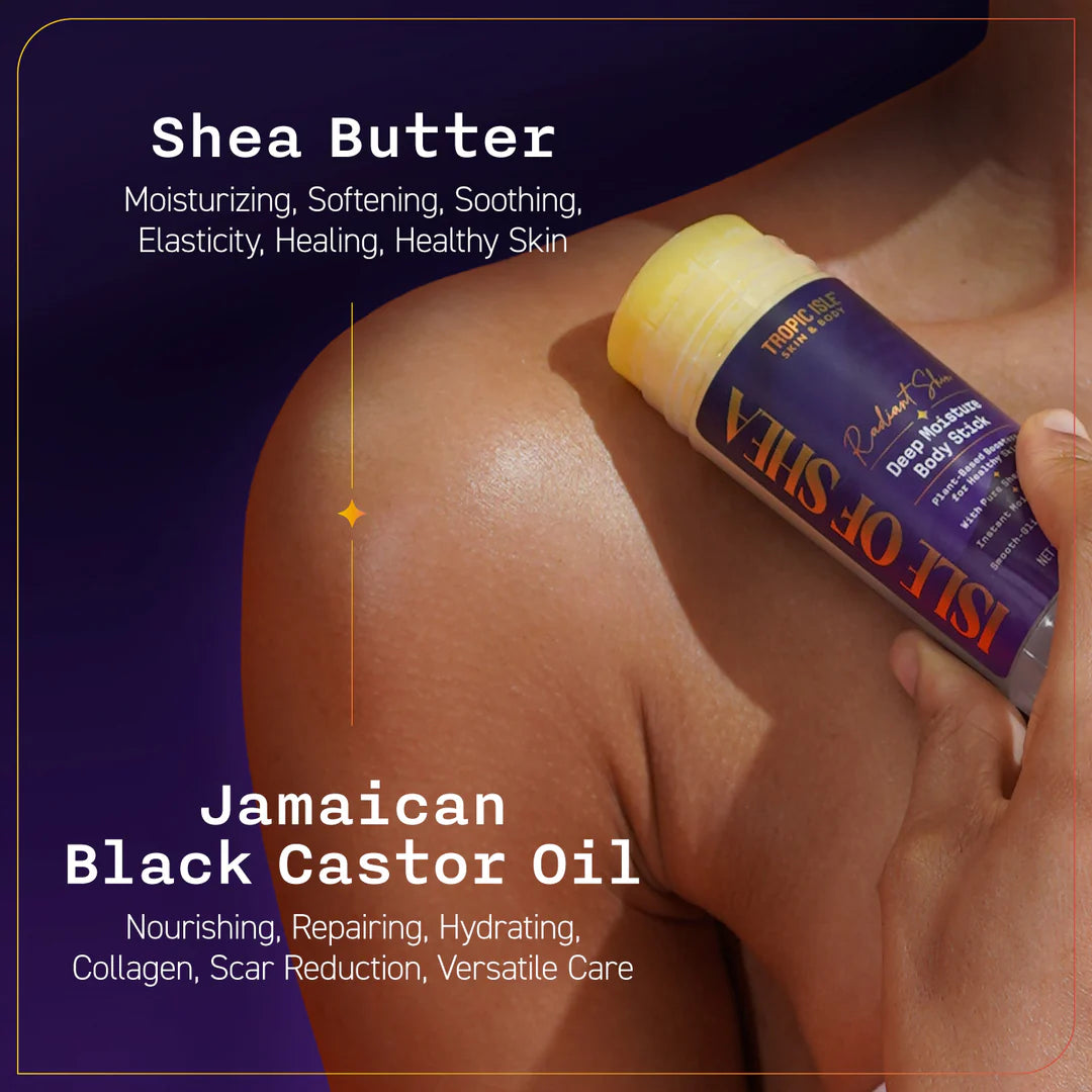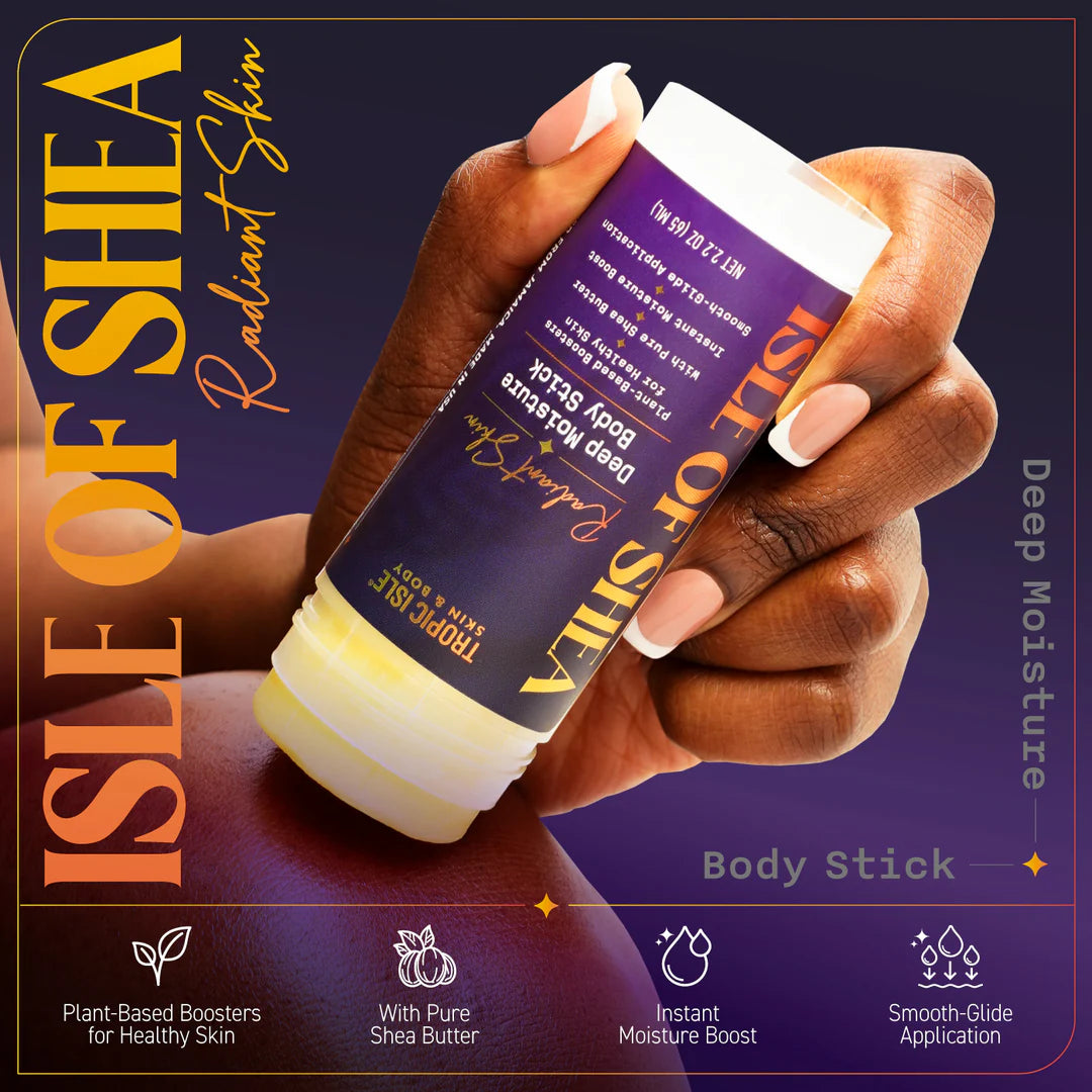 Give your skin an instant moisture boost with Tropical Isle Living ISLE OF SHEA Body Stick. Enriched with Shea Butter and Jamaican Black Castor Oil (JBCO), this easy-to-use stick provides deep moisture that lasts. Its smooth-glide application makes it perfect for targeting dry or rough areas, instantly nourishing and hydrating skin for a soft, smooth feel. Keep your skin deeply moisturized throughout the day with ISLE OF SHEA Body Stick.